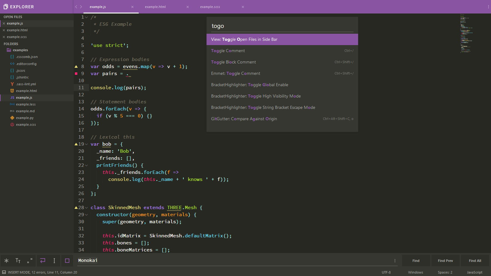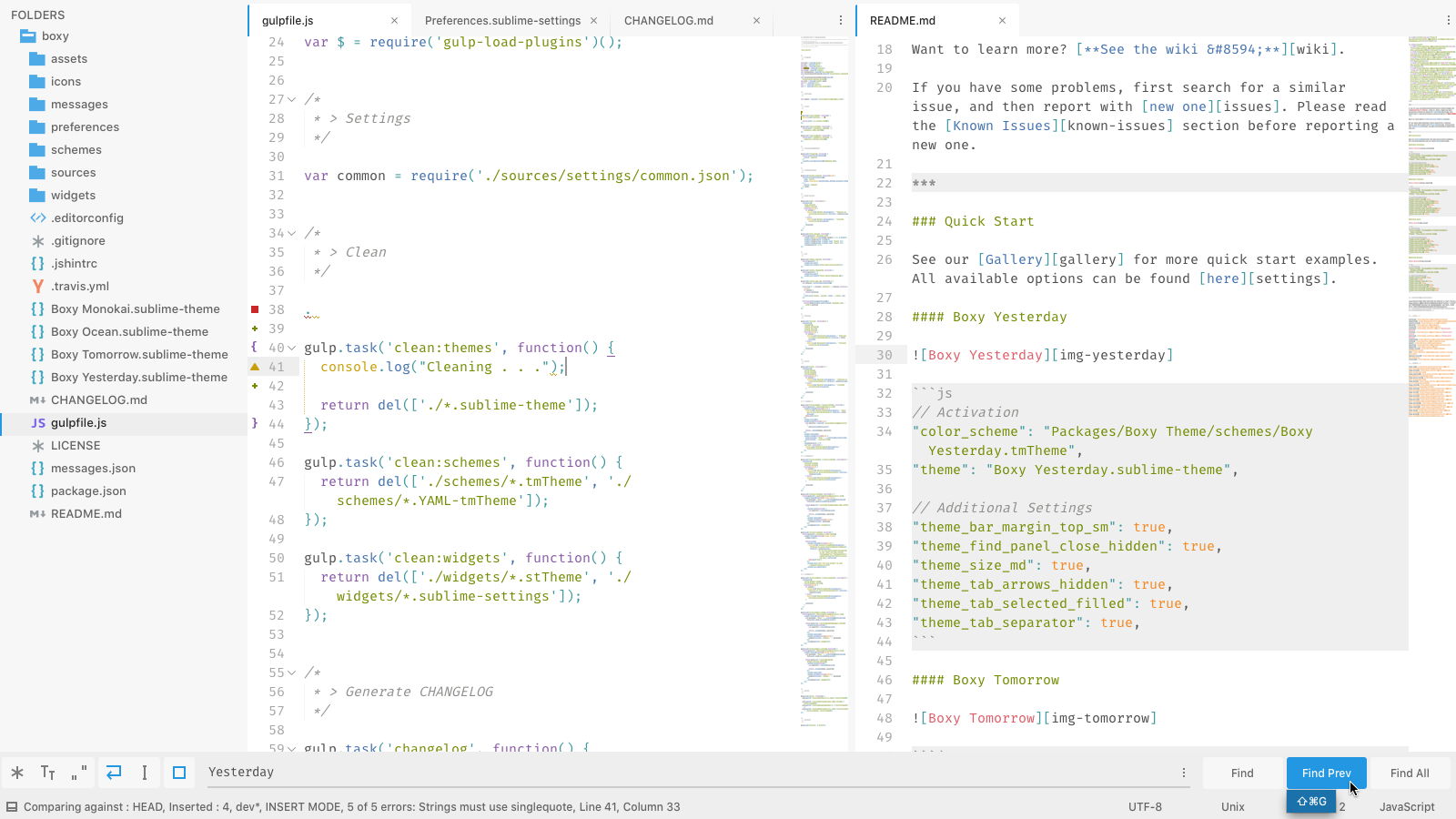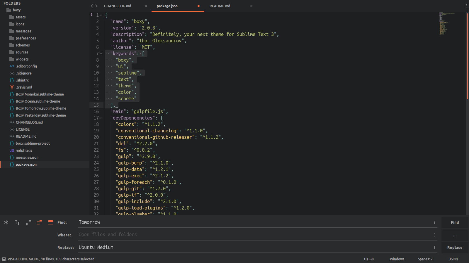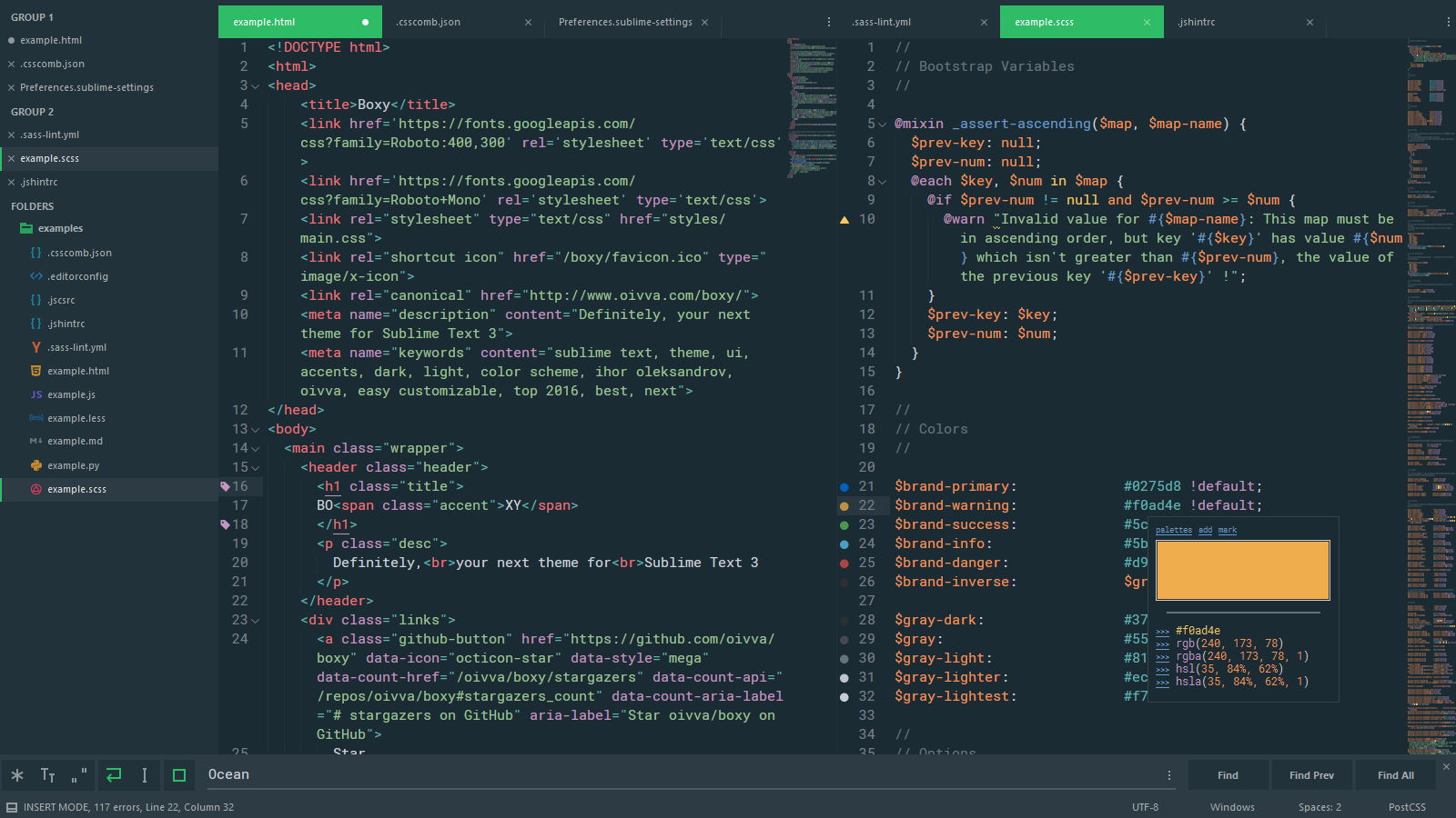 A set of easy customizable interface and syntax themes for Sublime Text 3 3103+. Comes in, both, light and dark variations. There are dozens of options that enable you to personalize your experience with Boxy Theme, don't forget to check them out.